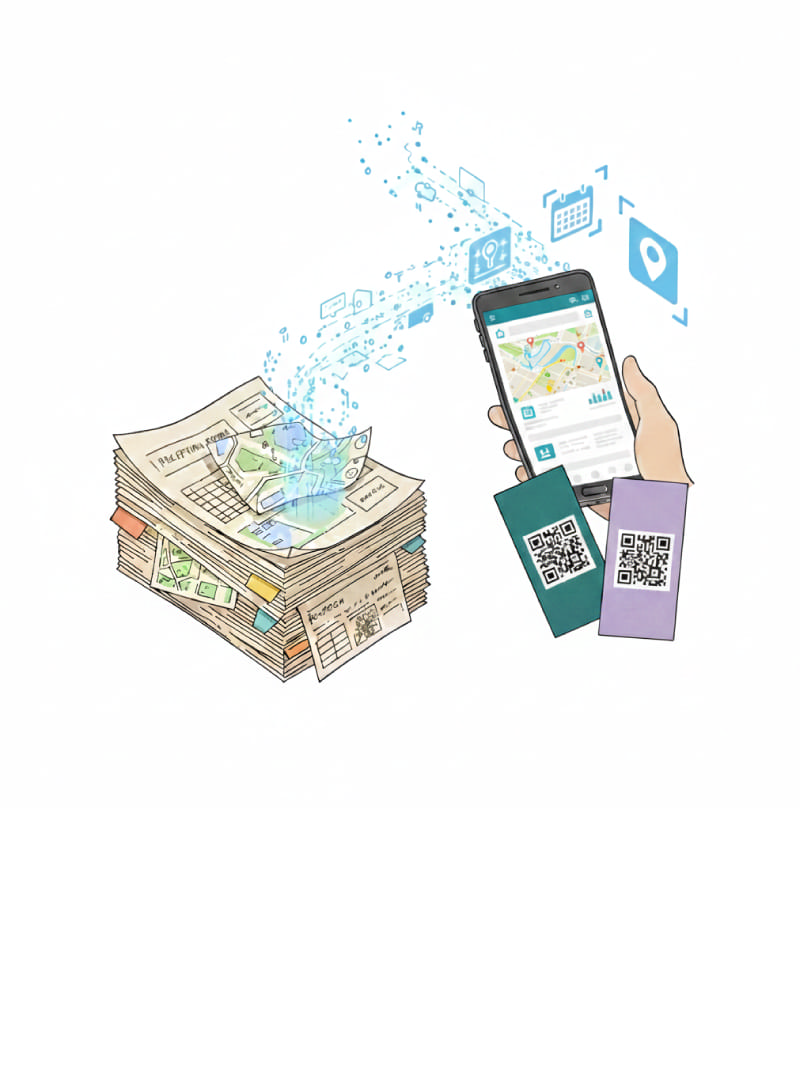 QRコードで地域のDX私たちは、その場所にいる「時間」の質を再定義します。事務的なストレスをデジタルでそぎ落とし、その土地、その場所ならではの体験価値を最大化します。