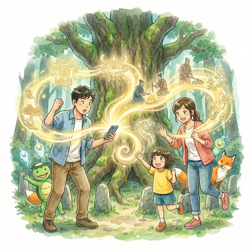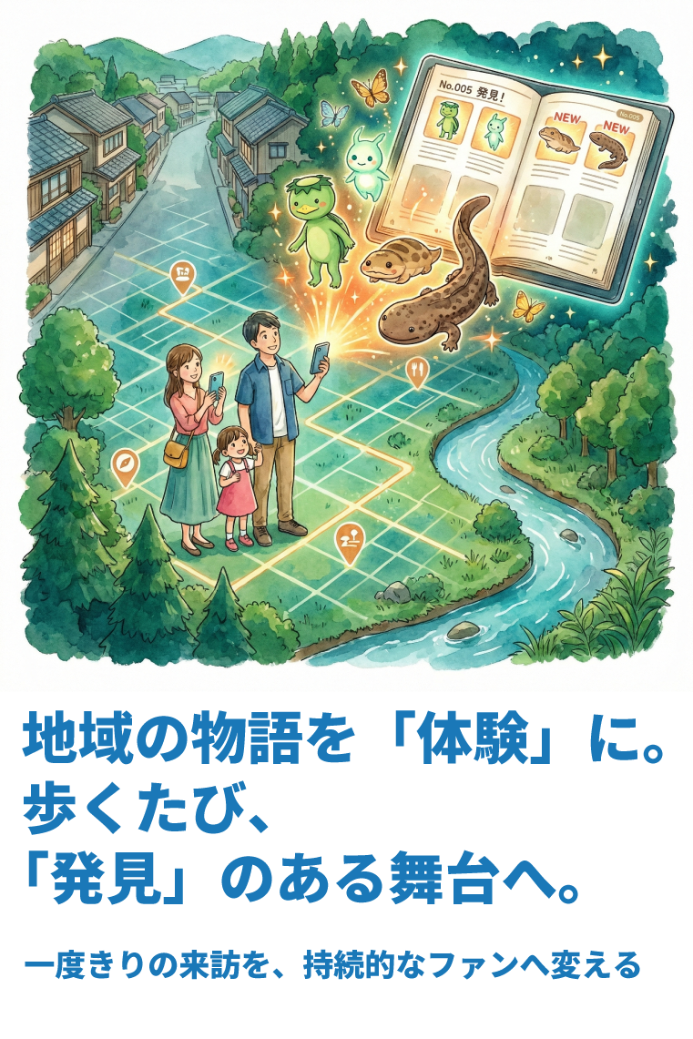 ただ歩くだけの観光を、能動的な「冒険」へとアップデートします。その土地に眠る伝承や歴史、豊かな生態系などの土地固有の資源をデジタルで可視化し、来訪者が自ら「発見」しながら楽しく周遊できる仕掛けを提供します。