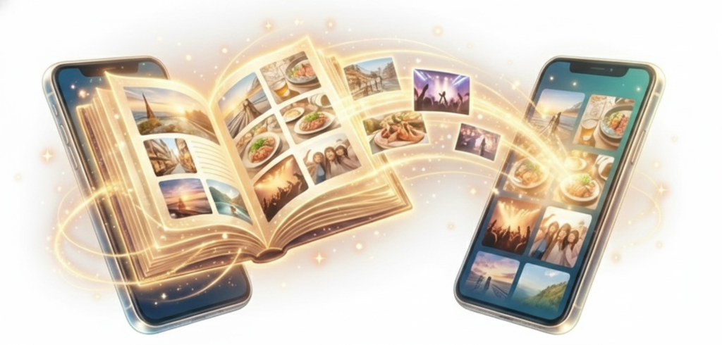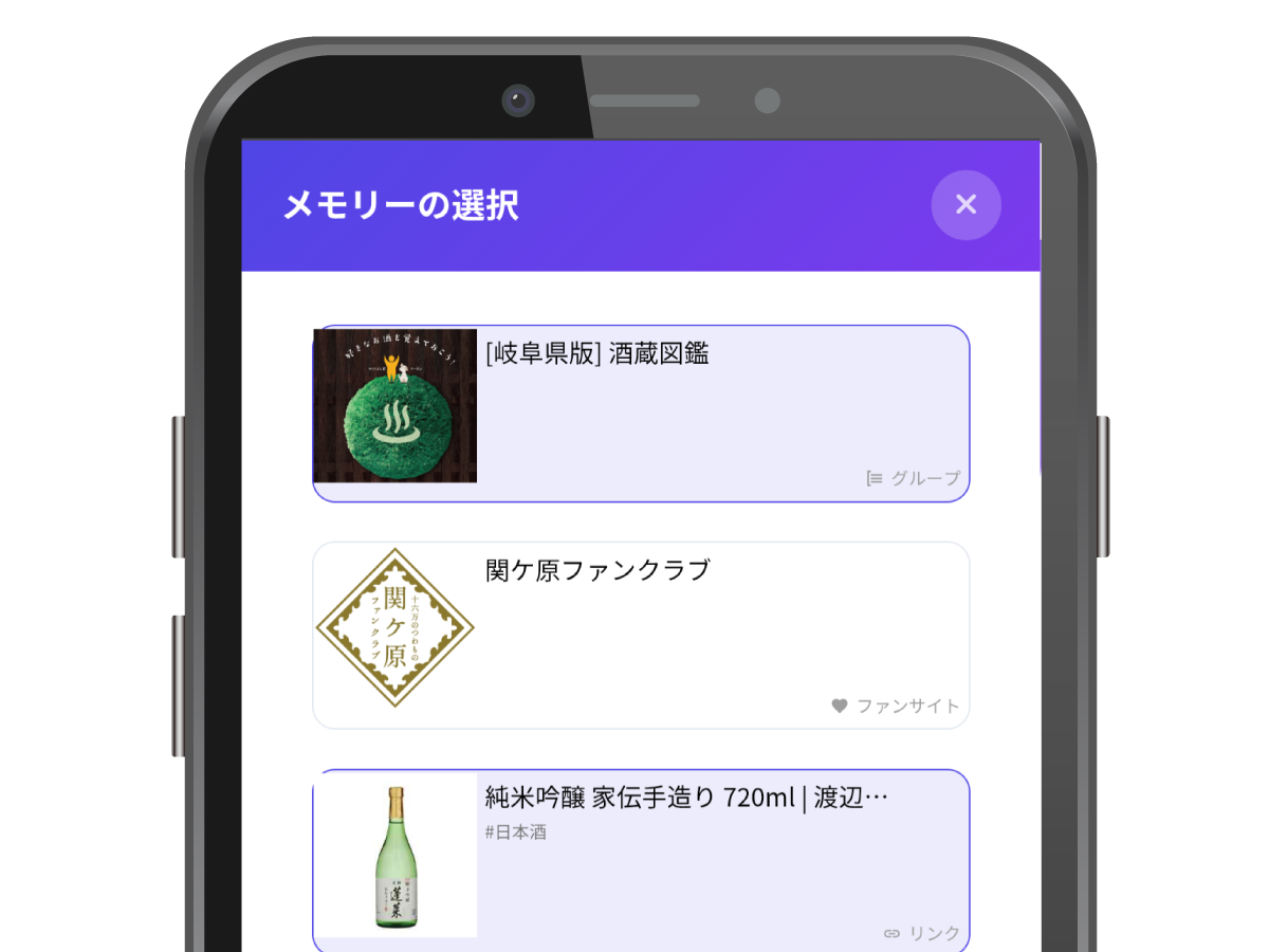 「グループ」機能を使えば、保存した思い出をテーマごとにまとめたページがつくれます。友達に、旅の思い出や、推し活ログなどを簡単シェア。