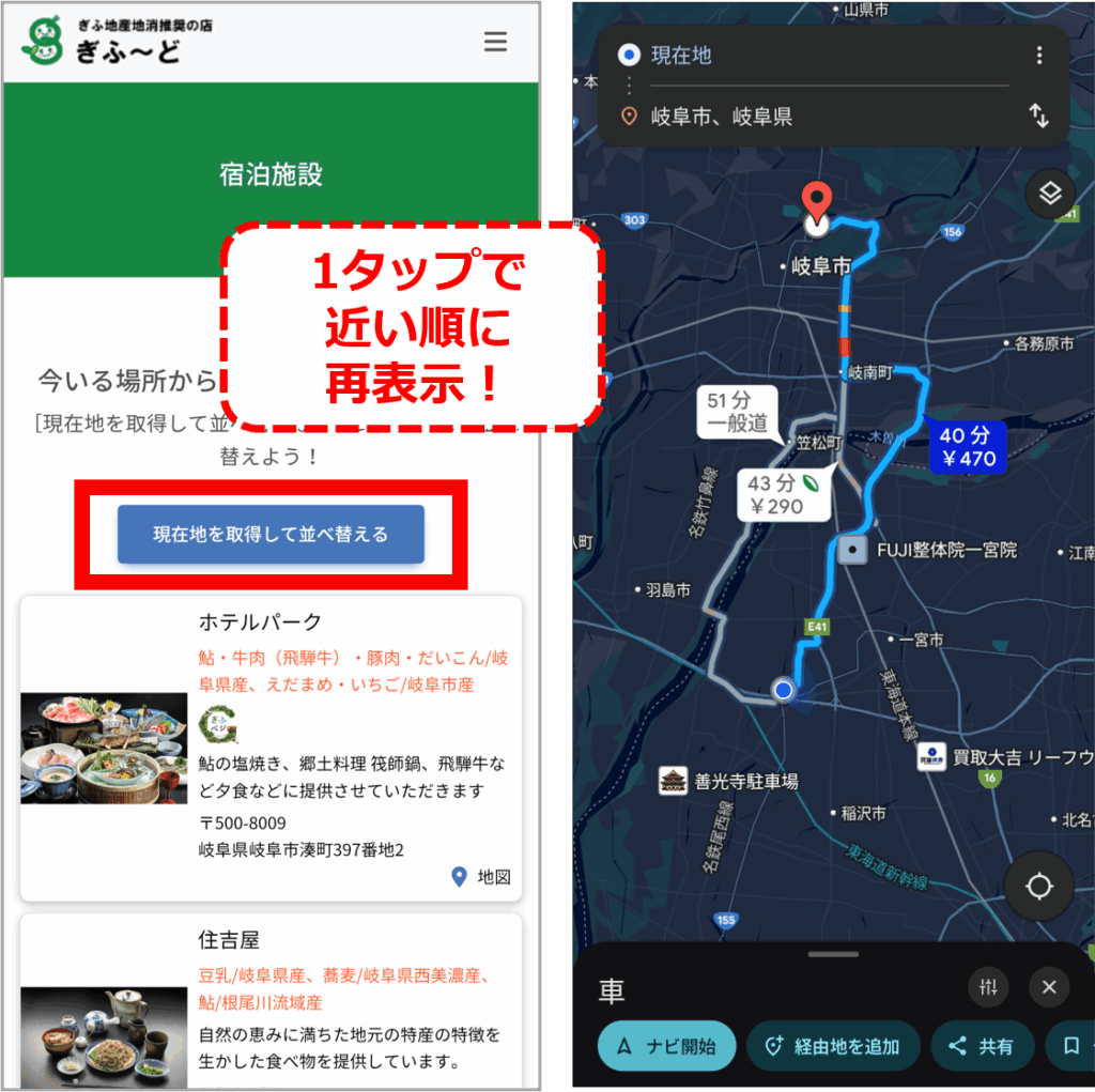現在地から近い順表示&MAPアプリ連携もスムーズ